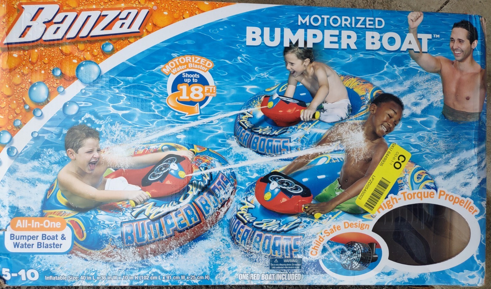. Web Holds up to 100lbs 45kg. BANZAI Aqua Blast Motorized Bumper Boat. Web Banzai 34179 Aqua Blast Motorized Bumper Boat- NEW box has imperfections Banzai.